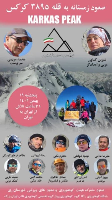 به مناسبت دهه مبارک فجر ، صعود زمستانه مشترک هیات کوهنوردی و صعودهای ورزشی شهرستان ری ، باشگاه کوهنوردی راگا ، گروه کوهنوردی پرواز و گروه تخصصی کوهنوردی فاتب تهران بزرگ به *قله ۳۸۹۵ متری کرکس* در مدت ۲۱ ساعت ( زمان حرکت از تهران و رسیدن به تهران ) انجام شد.