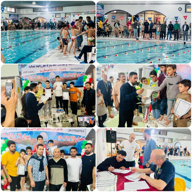 مسابقات شنا بمناسبت دهه مبارک فجر و اعیاد شعبانیه توسط اسکندری سرپرست هیات شنا، شیرجه و واترپلو شهرستان ری در استخر طالقانی شهرری برگزار ودر پایان به نفرات برتر حکم و مدال اهدا شد.