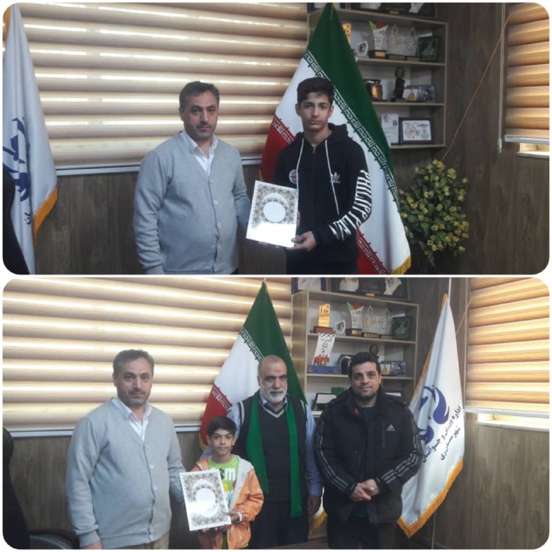 توسط یوسف زاده رئیس اداره ،حسینی مسئول حراست اداره و صمدی معاون ورزش اداره از سید آرشام خلیل پور قهرمان دو دوره مسابقات کشوری در سال ۱۴۰۱ و ۱۴۰۲رده سنی نونهالان رشته ووشو تالو تجليل بعمل آمد.
