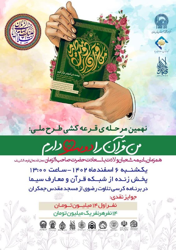 همزمان با نیمه شعبان سالروز ولادت باسعادت حضرت صاحب الزمان(عج)، نهمین مرحله قرعه کشی جوایز نقدی طرح ملی #من_قرآن_را_دوست_دارم برگزار می گردد: