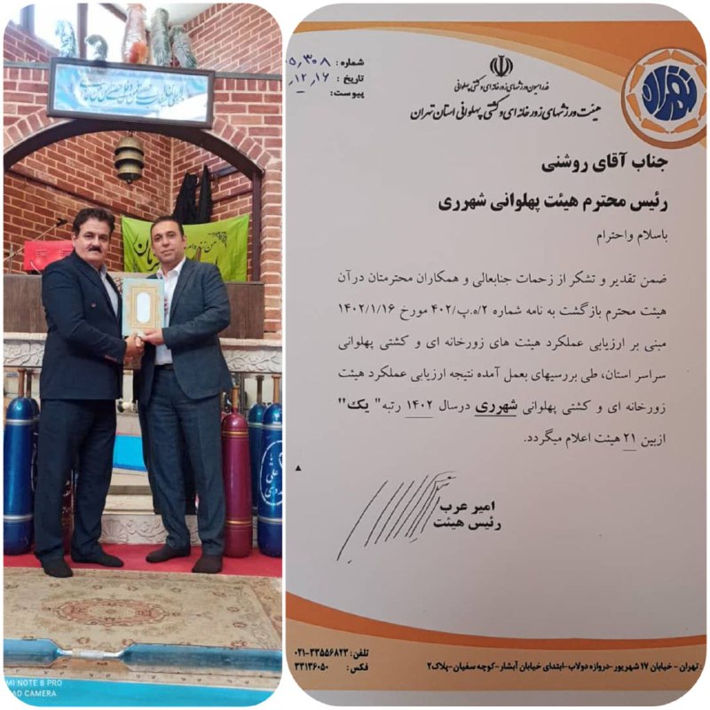 کسب رتبه برتر هیات ورزشهای زورخانه ای و کشتی پهلوانی شهرستان ری در ارزیابی و عملکرد استان تهران
