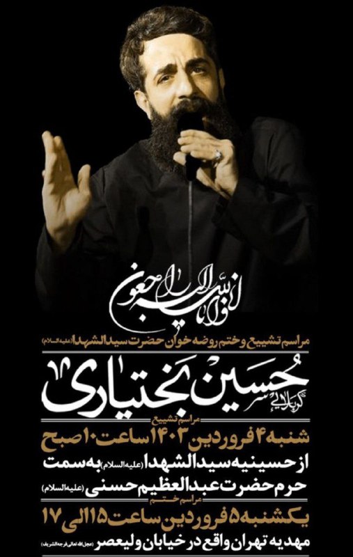مراسم ترحیم مرحوم حسین بختیاری، روز یکشنبه پنجم فروردین، از ساعت ۱۵ الی ۱۷ در مهدیه تهران برگزار خواهد شد.