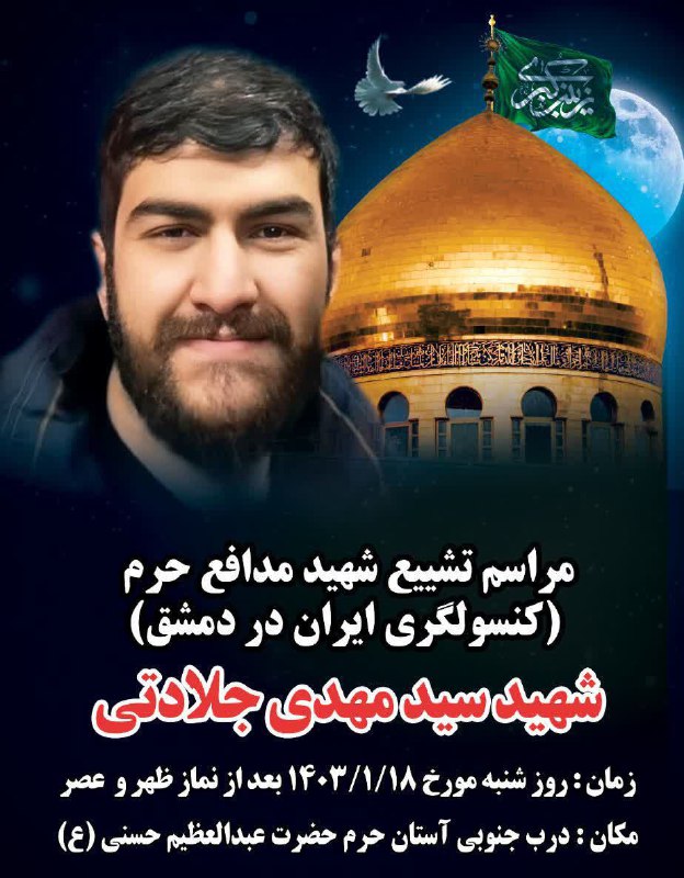 اخبار شهرستان ری سلامت عمومی سرویس سیاسی و اجتماعی راگا پرس ؛ فروردین 17, 1403 admin 0 دیدگاه اعلامیه مراسم تشییع پیکر مطهر شهید قدس سید مهدی جلالتی(از همراهان شهید سرلشکر زاهدی) فردا شنبه ۱۸ فروردین بین ساعت ۱۳ الی ۱۴ از درب جنوبی حرم حضرت عبدالعظیم حسنی(ع) برگزار و در شبستان امام خمینی آرام خواهد گرفت.