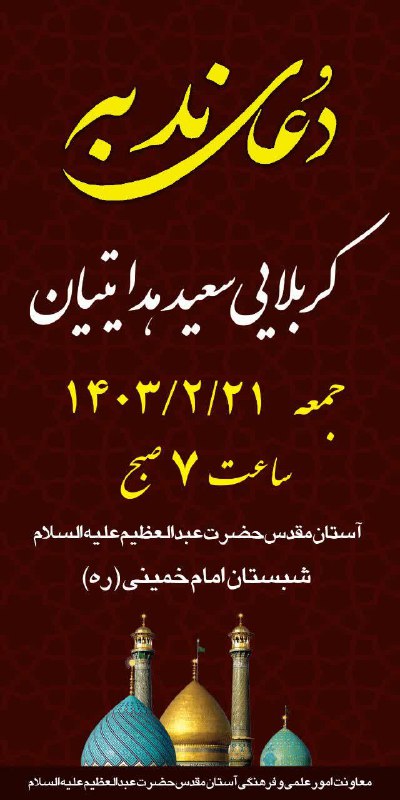 اخبار کوتاه حضرت عبدالعظیم شهری صبح قلعه نو: اردیبهشت 19, 1403 خبرنگار وبگاه صبح قلعه نو 0 دیدگاه #اطلاع_رسانی ویژه برنامه قرائت دعای ندبه با نوای: کربلایی سعید هدایتیان جمعه ۲۱ اردیبهشت ماه ساعت ۷صبح شبستان امام خمینی(ره) حرم مطهر حرم حضرت عبدالعظیم(ع)