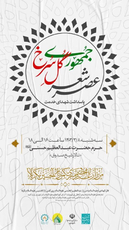 #عصر_شعر «جمهوری گل سرخ»، پاسداشت شهدای خدمت به همت #مرکز_آفرینش‌های_ادبی حوزه هنری با همکاری آستان مقدس حضرت عبدالعظیم حسنی(ع)، اداره کل فرهنگ و ارشاد اسلامی استان تهران و مجمع شاعران اهل بیت برگزار می‌شود.