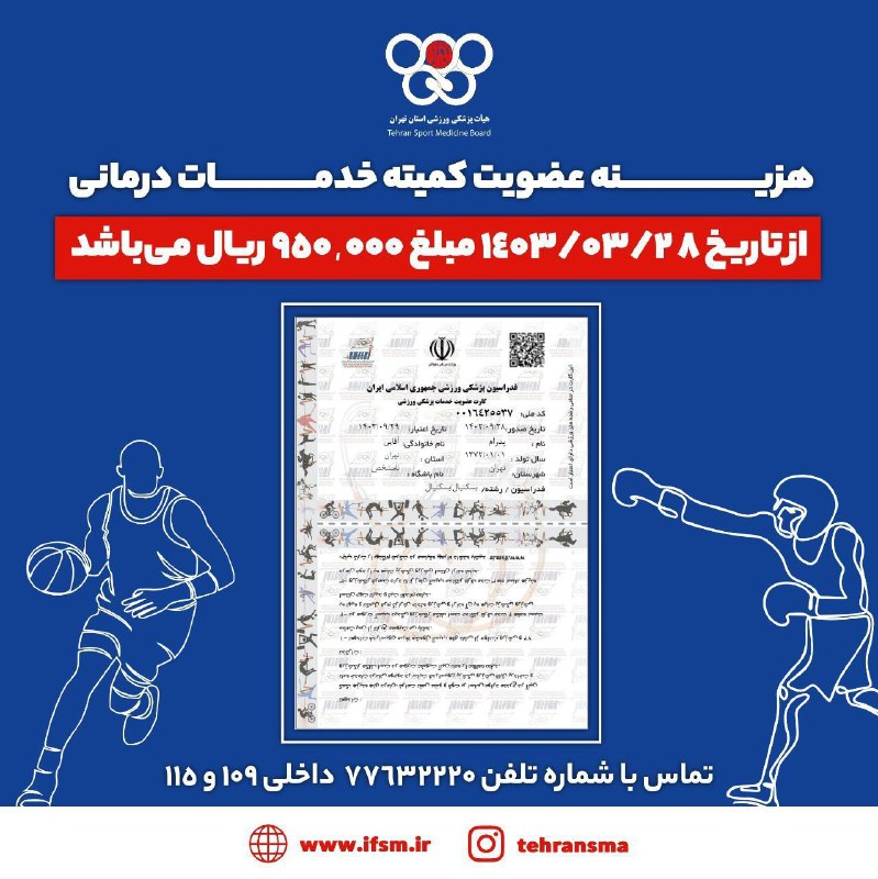 بر این اساس از ۲۸ خرداد ۱۴۰۳ هزینه صدور کارت بیمه ورزشی مبلغ ۹۵۰۰۰ تومان اعلام و تعیین شده است .
