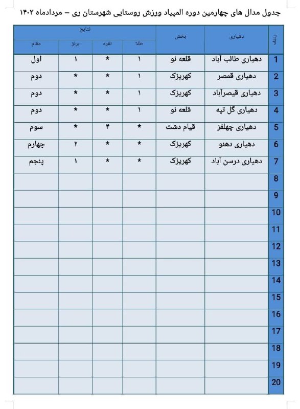 جدول توزیع مدال های پایان دومین روز چهارمین دوره المپیاد ورزش روستایی شهرستان ری