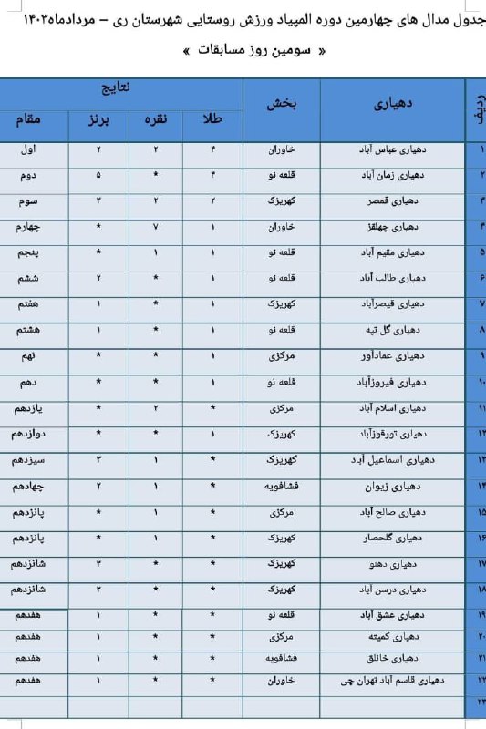جدول توزیع مدال های پایان سومین روز چهارمین دوره المپیاد ورزش روستایی شهرستان ری