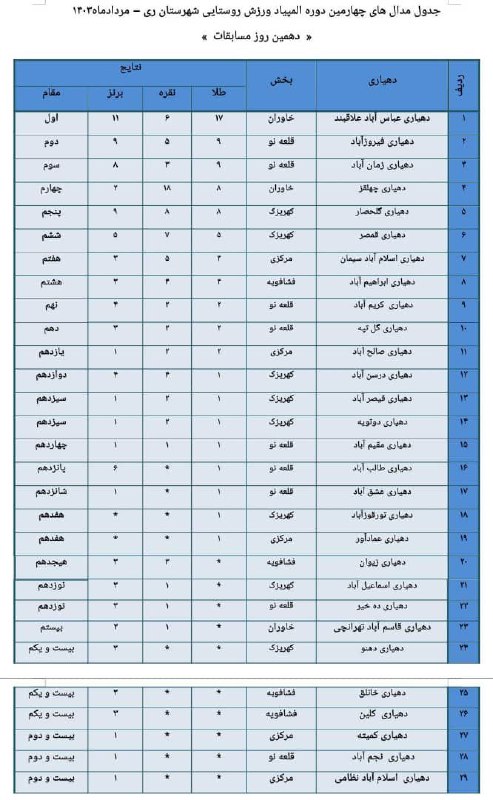 جدول توزیع مدال های پایان یازدهمین روز چهارمین دوره المپیاد ورزش روستایی شهرستان ری