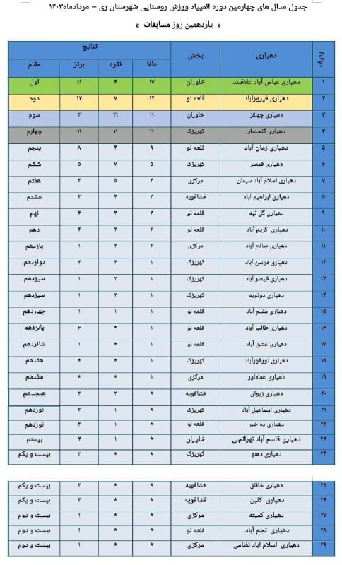 جدول توزیع مدال های پایان یازدهمین روز چهارمین دوره المپیاد ورزش روستایی شهرستان ری