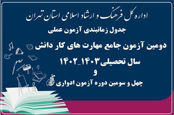 اداره کل فرهنگ و ارشاد اسلامی استان تهران، دومین آزمون جامع مهارت های کاردانش سال تحصیلی ۱۴۰۲_۱۴۰۳ و چهل و سومین دوره آزمون ادواری را در 2 مرحله آزمون های عملی و تئوری برگزار می کند.