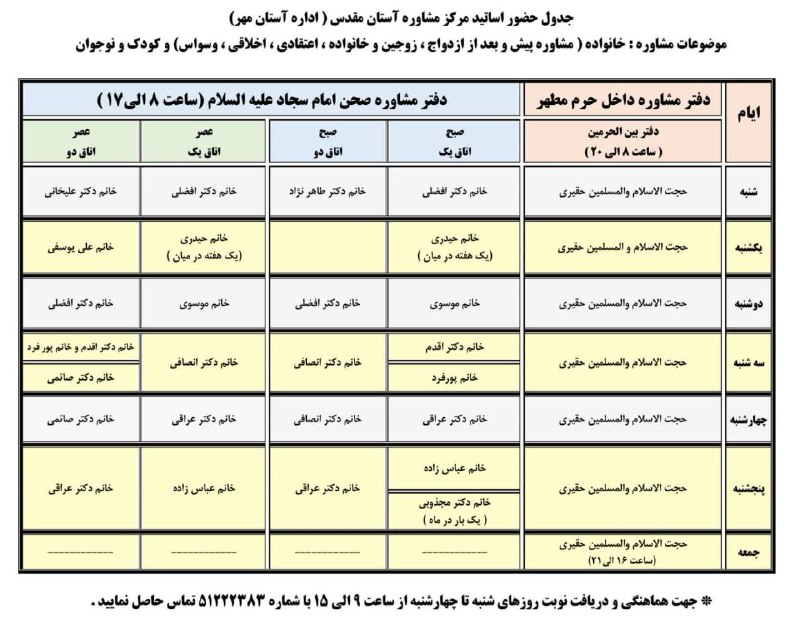 جدول حضور اساتید مرکز مشاوره آستان مقدس حضرت عبدالعظیم(ع)