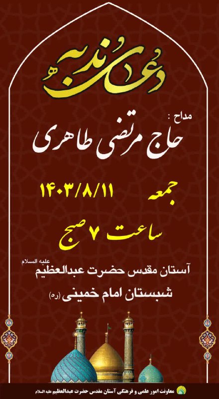 اخبار کوتاه حضرت عبدالعظیم شهری صبح قلعه نو: آبان 9, 1403 خبرنگار وبگاه صبح قلعه نو 0 دیدگاه #اطلاع_رسانی ویژه برنامه قرائت دعای ندبه با نوای: حاج مرتضی طاهری جمعه ۱۱ آبان ماه ساعت ۷صبح شبستان امام خمینی(ره) حرم مطهر حرم حضرت عبدالعظیم(ع)