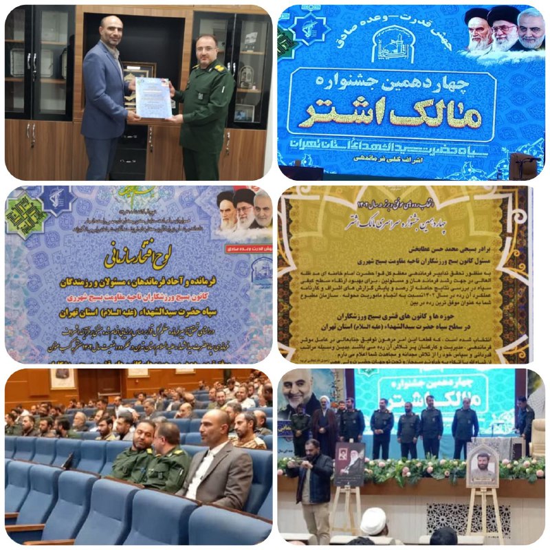به گزارش صبح قلعه نو چهاردهمین جشنواره سراسری مالک اشتر در بین حوزه ها و کانون های قشری سپاه حضرت سیدالشهدا ( علیه السلام ) استان تهران برگزار و لوح افتخار سازمانی توسط سرتیپ دوم پاسدار قربان محمد ولی زاده فرمانده سپاه استان تهران به عطابخش مسئول کانون بسیج ورزشکاران سپاه ناحیه ری بعنوان موفق ترین رده اهدا شد.