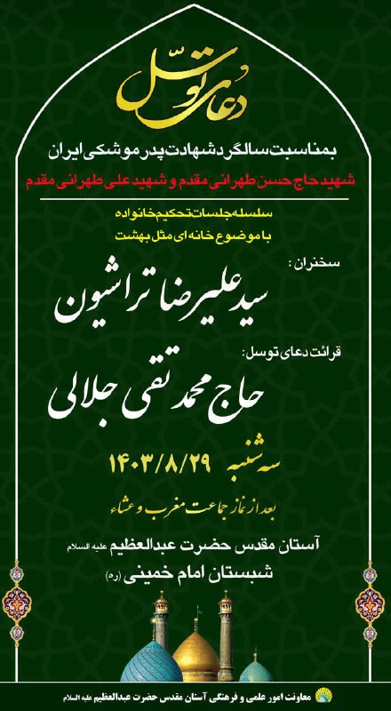 اخبار کوتاه حضرت عبدالعظیم شهری صبح قلعه نو: آبان 27, 1403 خبرنگار وبگاه صبح قلعه نو 0 دیدگاه #اطلاع_رسانی سلسله جلسات تحکیم خانواده با عنوان “خانه ای مثل بهشت” و قرائت دعای توسل سخنران: حجت الاسلام و المسلمین سید علیرضا تراشیونقرائت دعا: حاج محمد تقی جلالی سه شنبه ۲۹ آبان ماه بعد از نماز مغرب و عشاء شبستان امام خمینی(ره) حرم مطهر حرم حضرت عبدالعظیم(ع)