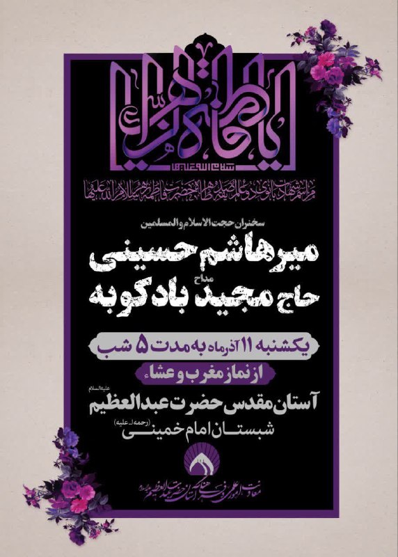 اخبار کوتاه حضرت عبدالعظیم شهری صبح قلعه نو: آذر 14, 1403 خبرنگار وبگاه صبح قلعه نو 0 دیدگاه #اطلاع_رسانی ویژه برنامه سوگواری ایام شهادت حضرت فاطمه زهرا(س) (فاطمیه دوم) سخنران:حجت الاسلاموالمسلمین میرهاشم حسینی مرثیه سرایی: حاج مجید بادکوبه از یکشنبه ۱۱ تا ۱۵ آذر ماه بعد از نماز مغرب و عشاء شبستان امام خمینی(ره) حرم مطهر حرم حضرت عبدالعظیم(ع)