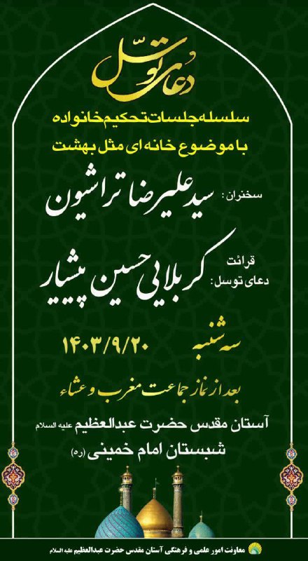 اخبار کوتاه حضرت عبدالعظیم شهری صبح قلعه نو: آذر 19, 1403 خبرنگار وبگاه صبح قلعه نو 0 دیدگاه #اطلاع_رسانی سلسله جلسات تحکیم خانواده با عنوان “خانه ای مثل بهشت” و قرائت دعای توسل سخنران: حجت الاسلام و المسلمین سید علیرضا تراشیونقرائت دعا: کربلایی حسین پیشیار سه شنبه ۲۰ آذر ماه بعد از نماز مغرب و عشاء شبستان امام خمینی(ره) حرم مطهر حرم حضرت عبدالعظیم(ع)