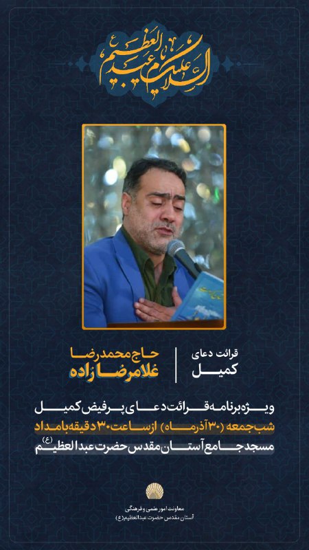 اخبار کوتاه حضرت عبدالعظیم شهری صبح قلعه نو: آذر 28, 1403 خبرنگار وبگاه صبح قلعه نو 0 دیدگاه #اطلاع_رسانی مراسم قرائت دعای کمیل(نیمه شب) با نوای حاج محمدرضا غلامرضازاده شب جمعه ۳۰ آذر ماه از ساعت ۳۰ دقیقه بامداد مسجد جامع آستان مقدس حضرت عبدالعظیم(ع) حرم حضرت عبدالعظیم(ع)