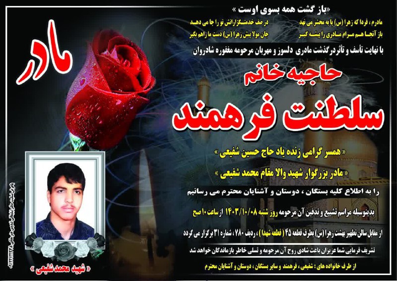 “حاجیه خانم سلطنت فرهمند” مادر مکرمه شهید محمد شفیعی از شهدای والامقام شهرری محله فیروزآبادی دار فانی را وداع گفت و به فرزند شهیدش پیوست.