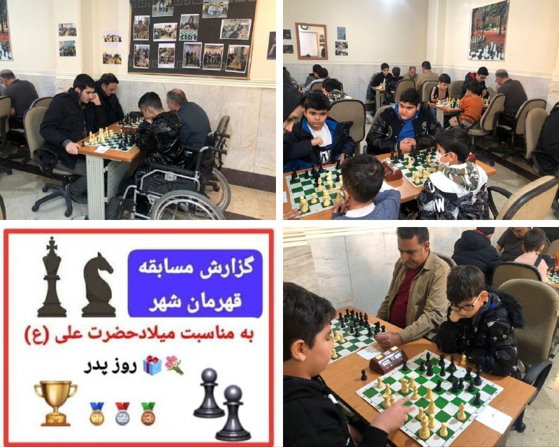 به مناسبت میلادحضرت علی علیه و “روز پدر” مسابقات شطرنج در تاریخ پنجشنبه ۲۰ دیماه با حضور ۲۸ نفر بازیکن «پسران و پدرای مهربان» در ۵ دور به روش سوئیسی در سرای محله شهید غیوری برگزار شد.