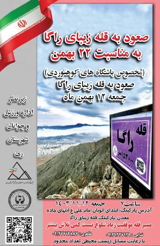روز جمعه ۱۲ بهمن ۱۴۰۳ ساعت شش و نیم صبح از پارکینگ کوهستان زیبای راگا با حضور باشگاه های کوهنوردی و مسئولین شهرستان ری شروع و صعود به شش قله راگا یک ، راگا دو، جلال ، بهشت ، طبرک و غدیر آغاز می گردد.