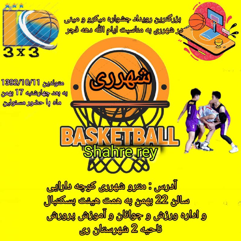 بزرگترین رویداد جشنواره میکرو و مینی بسکتبال به همت هیأت بسکتبال شهرستان ری و با مشارکت اداره آموزش و پرورش ناحیه ۲ ری بمناسبت گرامیداشت دهه مبارک فجر برگزار می نماید.