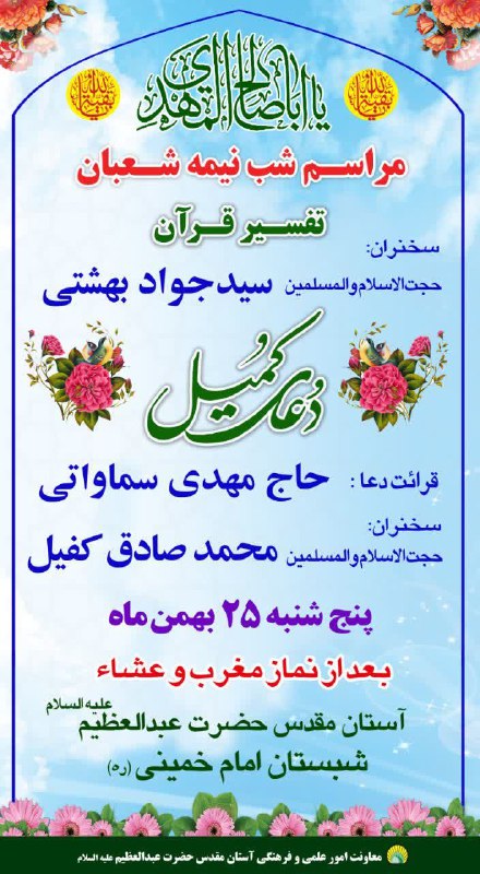 اخبار کوتاه حضرت عبدالعظیم شهری صبح قلعه نو: بهمن 24, 1403 خبرنگار وبگاه صبح قلعه نو 0 دیدگاه #اطلاع_رسانی جشن میلاد امام زمان(عج) در حرم مطهر سخنران(تفسیر قرآن کریم):حجت الاسلاموالمسلمین سید جواد بهشتی قرائت دعای کمیل و مدیحه خوانی: حاج مهدی سماواتی سخنران (معارف مهدوی):حجت الاسلاموالمسلمین محمدصادق کفیل پنج شنبه ۲۵ بهمن ماه پس از نماز مغرب و عشاء شبستان امام خمینی(ره) حرم مطهر حرم حضرت عبدالعظیم (ع)