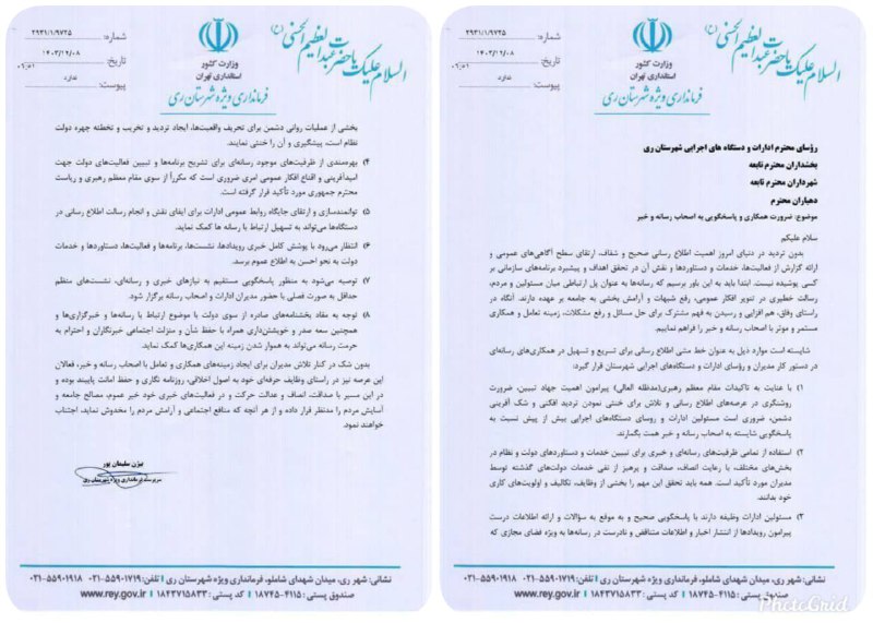 دستور ویژه فرماندار ری به روسای ادارات، جهت تعامل با اصحاب رسانه و خبرنگاران