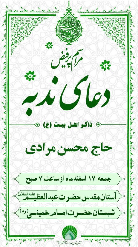اخبار کوتاه حضرت عبدالعظیم شهری صبح قلعه نو: اسفند 16, 1403 خبرنگار وبگاه صبح قلعه نو 0 دیدگاه #اطلاع_رسانی ویژه برنامه قرائت دعای ندبه با نوای: حاج محسن مرادی جمعه ۱۷ اسفند ماه ساعت ۷صبح شبستان امام خمینی(ره) حرم مطهر حرم حضرت عبدالعظیم(ع)
