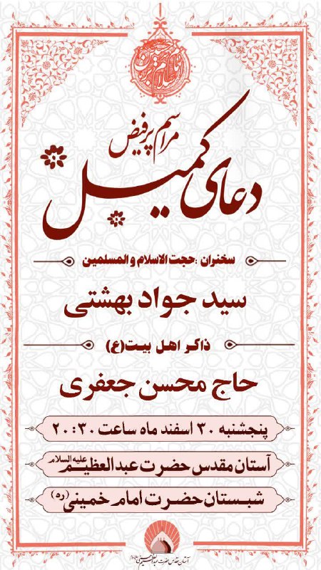 اخبار کوتاه حضرت عبدالعظیم شهری صبح قلعه نو: اسفند 30, 1403 خبرنگار وبگاه صبح قلعه نو 0 دیدگاه #اطلاع_رسانی ویژه برنامه قرائت دعای کمیل سخنران: حجت الاسلام و المسلمین سید جواد بهشتیقرائت دعا: حاج محسن جعفری پنجشنبه ۳۰ اسفند ماه از ساعت ۲۰:۳۰ شبستان امام خمینی(ره) حرم مطهر حضرت عبدالعظیم(ع) حرم حضرت عبدالعظیم(ع)