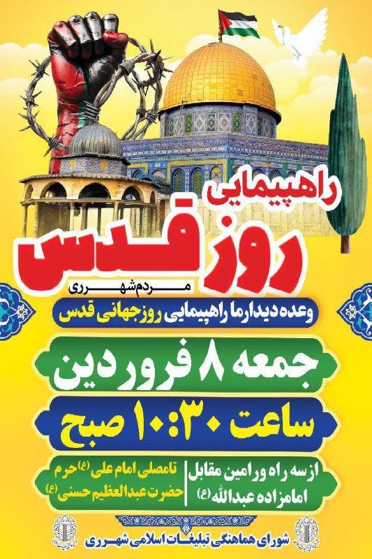 جامعه بزرگ ورزش و جوانان غیرتمند و بسیجی شهرستان ری ضمن محکوم کردن جنایات اسرائیل و امریکای ملعون علیه کودکان و زنان بی دفاع غزه و همگام با تمامی مسلمانان و مردم جهان در انجام وظیفه اسلامی و انقلابی خود با استفاده گسترده از فضای مجازی، صدای حمایت خود را از مبارزه برای آزادی فلسطین و نجات قدس شریف به گوش جهانیان می رسانیم.