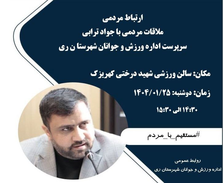 در راستای برگزاری دیدارهای چهره به چهره و حل مشکلات ورزشکاران، “جواد ترابی” سرپرست اداره ورزش و جوانان شهرستان ری در روز دوشنبه تاریخ ۱۴۰۴/۰۱/۲۵ ساعت ۱۴:۳۰ در سالن ورزشی شهید درختی کهریزک میزبان ورزشکاران و عموم مردم میباشد.