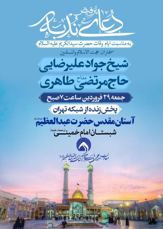اخبار کوتاه حضرت عبدالعظیم شهری صبح قلعه نو: فروردین 29, 1404 خبرنگار وبگاه صبح قلعه نو 0 دیدگاه #اطلاع_رسانی ویژه برنامه قرائت دعای ندبه سخنران: حجت الاسلام و المسلمین جواد علیرضاییقرائت دعا: حاج مرتضی طاهری جمعه ۲۹ فروردین ماه ساعت ۷ صبح شبستان امام خمینی(ره) حرم مطهر حضرت عبدالعظیم(ع) پخش زنده از شبکه تهران سیما حرم حضرت عبدالعظیم(ع)