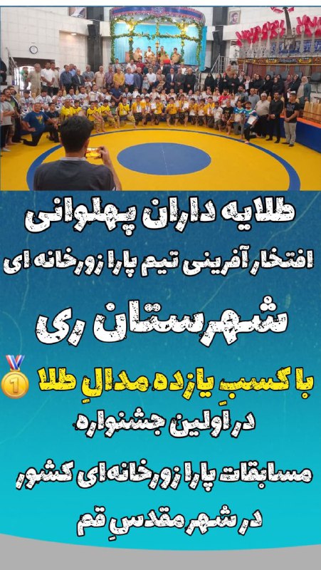 تیم پارا زورخانه ای (فرشتگان زمینی) شهرستان ری، با حضوری مقتدرانه در نخستین جشنواره پهلوانی و زورخانه‌ای کشور که در شهر قم برگزار شد، توانست برگ زرینی دیگر در افتخارات ورزشی این شهرستان رقم بزند.