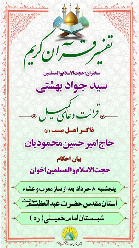 اخبار کوتاه حضرت عبدالعظیم شهری صبح قلعه نو: خرداد 7, 1404 خبرنگار وبگاه صبح قلعه نو 0 دیدگاه #اطلاع_رسانی سلسله جلسات تفسیر قرآن کریم، قرائت دعای کمیل و بیان احکام سخنران: حجت الاسلام و المسلمین سید جواد بهشتیقرائت دعا: حاج امیرحسین محمودیانبیان احکام: حجت الاسلام و المسلمین اخوان پنجشنبه ۸ خرداد ماه بعد از نماز مغرب و عشاء شبستان امام خمینی(ره) حرم مطهر حضرت عبدالعظیم(ع) حرم حضرت عبدالعظیم(ع)