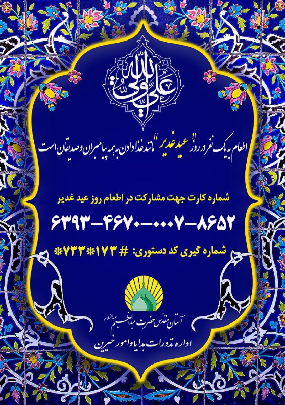 اخبار کوتاه حضرت عبدالعظیم صبح قلعه نو: خرداد 18, 1404 خبرنگار وبگاه صبح قلعه نو 0 دیدگاه #نذورات#عید_غدیر مشارکت در طرح اطعام روز عید غدیر شماره کارت:6393467000078652 شماره گیری کد دستوری: *۷۳۳*۱۷۳# جهت کسب اطلاعات بیشتر با شماره ۵۵۹۳۸۰۰۹ تماس حاصل نمایید. حرم حضرت عبدالعظیم(ع)