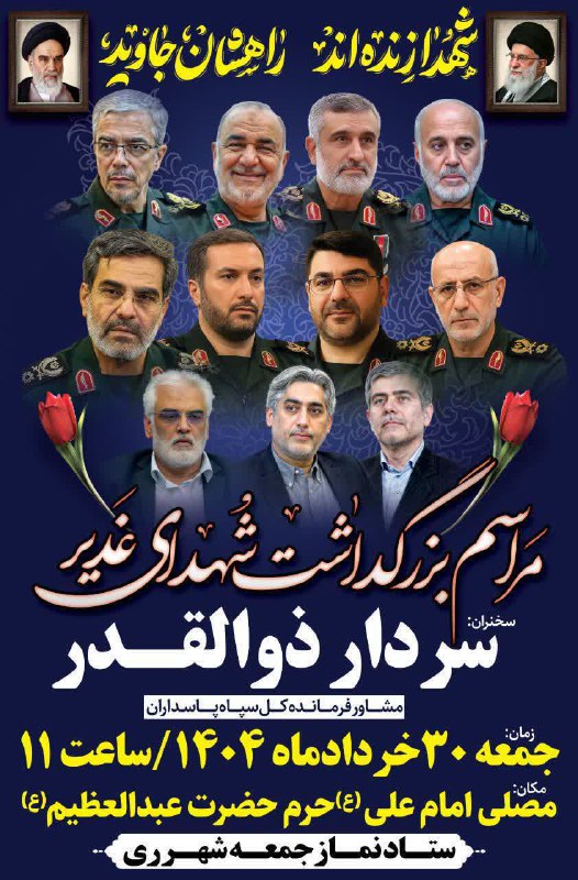 اخبار شهرستان ری سلامت عمومی سرویس سیاسی و اجتماعی راگا پرس ؛ خرداد 27, 1404 admin 0 دیدگاه مراسم بزرگداشت شهدای غدیر با سخنرانی سردار ذوالقدر مشاور فرمانده کل سپاه پاسداران زمان: جمعه ۳۰ خردادماه راس ساعت ۱۱ مکان: مصلی امام علی حرم حضرت عبدالعظیم الحسنی(ع) ستاد برگزاری نماز جمعه شهرری