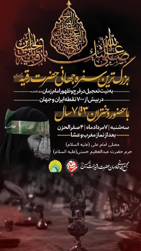 اخبار کوتاه حضرت عبدالعظیم شهری صبح قلعه نو: مرداد 6, 1404 خبرنگار وبگاه صبح قلعه نو 0 دیدگاه #اطلاع_رسانی برگزاری بزرگترین سفره نمادین حضرت رقیه(س) در بارگاه ملکوتی حضرت عبدالعظیم(ع) با حضور دختران ۳ تا ۷ سال سهشنبه ۷ مردادماه بعد از نماز مغرب و عشاء مصلای امام علی(ع) حرم مطهر حضرت عبدالعظیم(ع) حرم حضرت عبدالعظیم(ع)