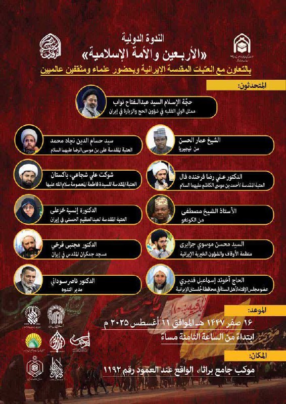 به همت کارگروه بین الملل اجلاسیه آستان های مقدس و بقاع متبرکه و مشارکت معاونت امور بین الملل نشست بین المللی با موضوع «اربعین و امت اسلامی» با حضور علما و اندیشمندان جهان اسلام برگزار خواهد شد.