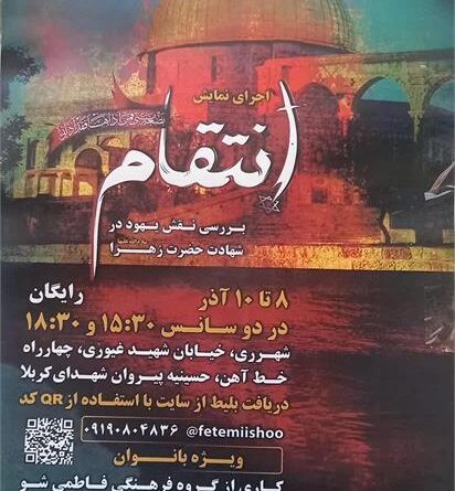 بیشتر بخوانیدبه مناسبت ایام فاطمیه و شهادت حضرت زهرا(س)، نمایش مذهبی « انتقام» کاری از از هنرمندان عرصه نمایش شهرستان ری به روی صحنه می رود.